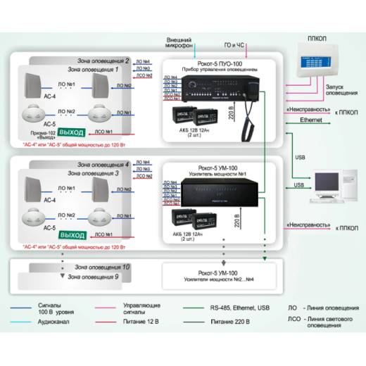 Основой системы оповещения является прибор управления оповещением «Рокот-5 ПУО-100», усилитель мощности «Рокот-5 УМ-100» и акустические системы АС-4 и АС-5, подключенные с помощью соединительных линий. Прибор предназначен для использования в составе автономной или централизованной системы оповещения и пожарной сигнализации для трансляции предварительно записанных речевых сообщений и музыкальных программ через линейный вход, сигналов «ГО и ЧС», речевых сообщений через микрофонный разъём.