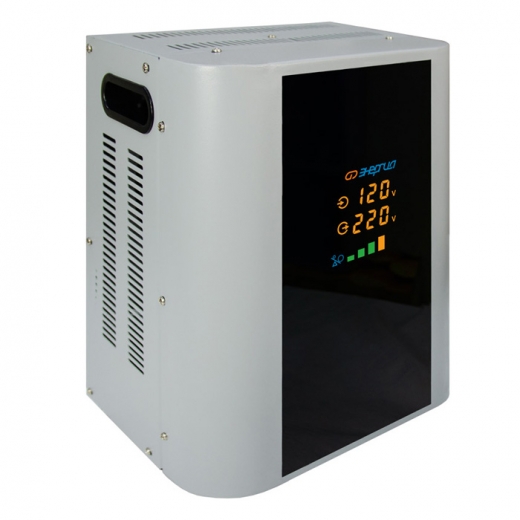 Принцип работы – комбинированный сервоприводно-релейный – в зависимости от напряжения сети. В диапазоне 105-144 В – релейный, а в диапазоне 144-256 В – сервоприводный. Сервоприводному принципу стабилизации присуща высокая точность, поскольку плавная регулировка позволяет добиться минимальных отклонений выходного напряжения от эталонного значения в 220 В. Релейный же принцип работы обеспечивает высокую скорость регулировки и расширяет рабочий диапазон входного напряжения.