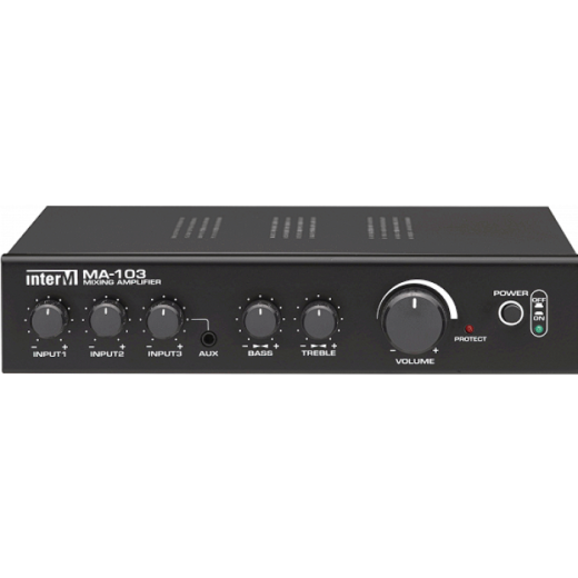 Микшер-усилитель MA-103 рассчитан на работу с трансляционными линиями 100 В или 70 В, кроме этого предусмотрено подключение профессиональных акустических систем с импедансом 8 Ом. Питание микшер-усилителя осуществляется от сети переменного тока напряжением 220 В 50 Гц.