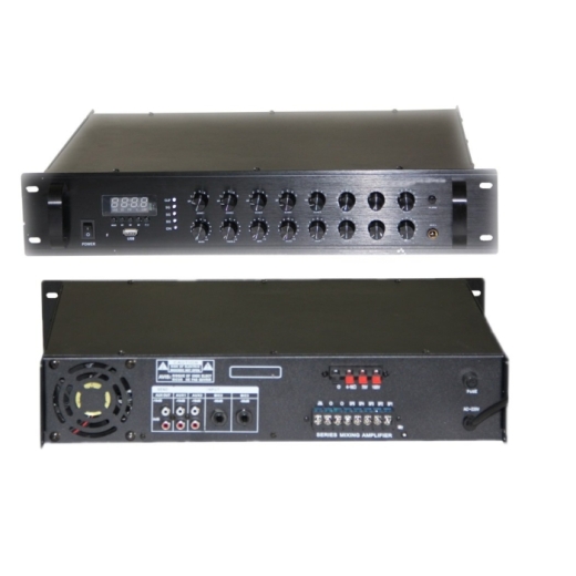 Усилитель 240Вт. 3 микрофонных входа. (MIC1 с функцией «Приоритет»). 70В/100В/4-16Ом, 5 зон/Alarm/USB/Bluetooth/FM. Материал корпуса: Металл (чёрного цвета), 482х310х88мм.