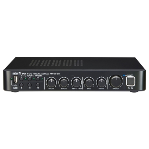 Inter-M PU-106 – компактный трансляционный микшер-усилитель с встроенным источником сигналов и номинальной выходной мощностью 60 Вт, применяемый для построения 1-зонных систем озвучивания и оповещения небольших объектов (кафе, магазины, салоны красоты и др.).