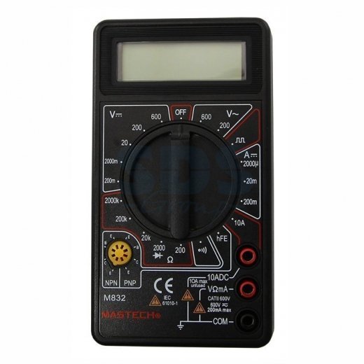 Мультиметр Mastech M832 - электроизмерительный прибор который включает в себя несколько функций и набор измеряемых параметров. Все приборы серии M832 измеряют постоянное и переменное напряжение, постоянный ток и сопротивление в цепи. А так же с помощью данного прибора можно проводить тестирование диодов, и осуществлять прозвонку целостности цепи. Еще одной отличительной особенностью данного прибора является функция генерирования прямоугольных сигналов (меандр), эта функция нужна для измерений и преобразований сигнала и в других областях. Прибор M832 является портативным мультиметром, компактные размеры позволяют всегда носить его с собой. Но, несмотря на малые размеры, данный мультиметр обладает широким функционалом и это выгодно отличает его от других. Инженеры старались сделать прибор максимально удобным для использования. Выбор измеряемых величин и пределов измерений производиться с помощью усиленного поворотного регулятора, благодаря которому исключается возможность случайного нажатия. Прибор изготовлен из высококачественных материалов, калибровка и тестирование приборов произведено под контролем компании REXANT INTERNATIONAL.