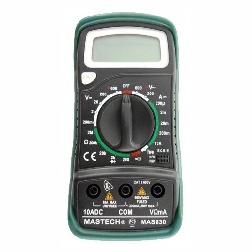 Мультиметр Mastech MAS830B - электроизмерительный прибор который включает в себя несколько функций и набор измеряемых параметров. Все приборы серии MAS830 измеряют постоянное и переменное напряжение, постоянный ток и сопротивление в цепи. А так же с помощью данного прибора можно проводить тестирование диодов. Прибор MAS830B является портативным мультиметром, компактные размеры позволяют всегда носить его с собой. Но, несмотря на малые размеры, данный мультиметр обладает широким функционалом и это выгодно отличает его от других. Прибор имеет функцию удержания результата измерений Data hold, для тех случаев, когда измерения проводятся в труднодоступных местах и не всегда есть возможность взглянуть на экран. Инженеры старались сделать прибор максимально удобным для использования. Выбор измеряемых величин и пределов измерений производиться с помощью усиленного поворотного регулятора, благодаря которому исключается возможность случайного нажатия. Прибор изготовлен из высококачественных материалов, калибровка и тестирование приборов произведено под контролем компании REXANT INTERNATIONAL.