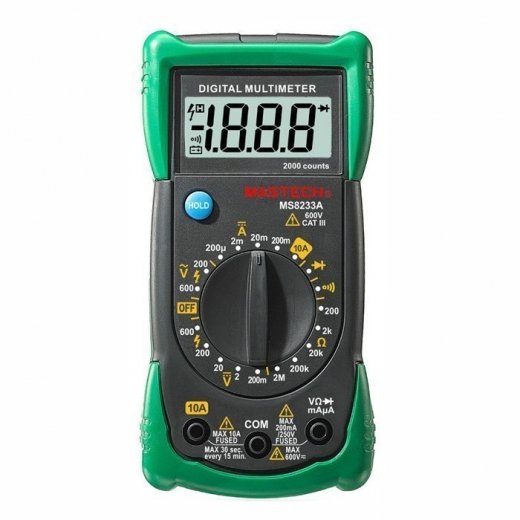 Мультиметр Mastech MS8233A - электроизмерительный прибор который включает в себя несколько функций и набор измеряемых параметров. Все приборы серии MS8233 измеряют постоянное и переменное напряжение, а так же постоянный ток и сопротивление в цепи. А так же с помощью данного прибора можно проводить тестирование диодов и осуществлять прозвонку целостности цепи. Прибор MS8233A является портативным мультиметром, компактные размеры позволяют всегда носить его с собой. Но, несмотря на малые размеры, данный мультиметр обладает широким функционалом и это выгодно отличает его от других. Прибор имеет функцию удержания результата измерений Data hold, для тех случаев, когда измерения проводятся в труднодоступных местах и не всегда есть возможность взглянуть на экран. Инженеры старались сделать прибор максимально удобным для использования. Выбор измеряемых величин и пределов измерений производиться с помощью усиленного поворотного регулятора, благодаря которому исключается возможность случайного нажатия. Прибор изготовлен из высококачественных материалов, калибровка и тестирование приборов произведено под контролем компании REXANT INTERNATIONAL.