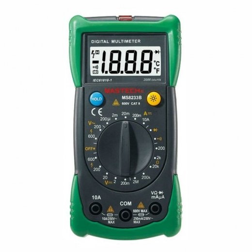 Мультиметр Mastech MS8233B - электроизмерительный прибор который включает в себя несколько функций и набор измеряемых параметров. Все приборы серии MS8233 измеряют постоянное и переменное напряжение, а так же постоянный ток и сопротивление в цепи. А так же с помощью данного прибора можно проводить тестирование диодов и осуществлять прозвонку целостности цепи. Так же мультиметр MS8233B оборудован специальным датчиком, с помощью которого вы бесконтактно сможете определить есть ли напряжение на участке, например в розетке, если есть необходимость демонтировать ее, то с помощью данного мультиметра вы сможете сразу узнать, если ли в ней напряжение. Таким образом, один прибор сможем заменить сразу несколько устройств одновременно. Прибор MS8233B является портативным мультиметром, компактные размеры позволяют всегда носить его с собой. Но, несмотря на малые размеры, данный мультиметр обладает широким функционалом и это выгодно отличает его от других. Прибор имеет функцию удержания результата измерений Data hold, для тех случаев, когда измерения проводятся в труднодоступных местах и не всегда есть возможность взглянуть на экран. Дисплей прибора оснащен подсветкой, которая позволяет проводить измерения даже в слабоосвещенных местах. Инженеры старались сделать прибор максимально удобным для использования. Выбор измеряемых величин и пределов измерений производиться с помощью усиленного поворотного регулятора, благодаря которому исключается возможность случайного нажатия. Прибор изготовлен из высококачественных материалов, калибровка и тестирование приборов произведено под контролем компании REXANT INTERNATIONAL.