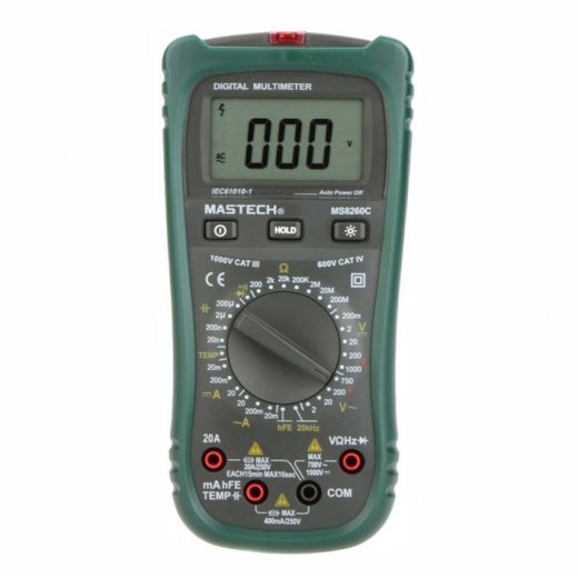 Мультиметр Mastech MS8260C - электроизмерительный прибор который включает в себя несколько функций и набор измеряемых параметров. Все приборы серии MS8260 измеряют постоянное и переменное напряжение, а так же постоянный и переменный ток, сопротивление в цепи, емкость, частоту и даже температуру. А так же с помощью данного прибора можно проводить тестирование диодов, прозвонку целостности цепи и измерение коэффициента усиления транзисторов. Так же мультиметр MS8260C оборудован специальным датчиком, с помощью которого вы бесконтактно сможете определить есть ли напряжение на участке, например в розетке, если есть необходимость демонтировать ее, то с помощью данного мультиметра вы сможете сразу узнать, если ли в ней напряжение. Таким образом, один прибор сможем заменить сразу несколько устройств одновременно. Прибор MS8260C является портативным мультиметром, компактные размеры позволяют всегда носить его с собой. Но, несмотря на малые размеры, данный мультиметр обладает широким функционалом и это выгодно отличает его от других. Прибор имеет функцию удержания результата измерений Data hold, для тех случаев, когда измерения проводятся в труднодоступных местах и не всегда есть возможность взглянуть на экран. Дисплей прибора оснащен подсветкой, которая позволяет проводить измерения даже в слабоосвещенных местах. Инженеры старались сделать прибор максимально удобным для использования. Выбор измеряемых величин и пределов измерений производиться с помощью усиленного поворотного регулятора, благодаря которому исключается возможность случайного нажатия. Прибор изготовлен из высококачественных материалов, калибровка и тестирование приборов произведено под контролем компании REXANT INTERNATIONAL.