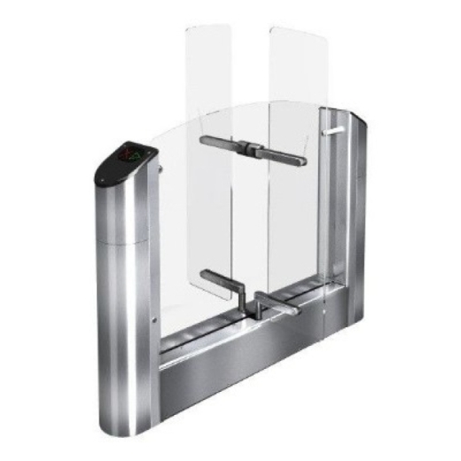 Тумбовый турникет «скоростной проход» со стеклянными створками; напольный; центральный модуль турникета с высокими створками на 1500 мм;, ширина прохода 660мм. Корпус из шлифованной нержавеющей стали; автоматическая доводка планок двигателем; автоматическая функция «Антипаника».