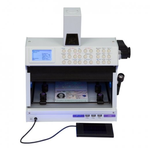 Имеет встроенный считыватель бесконтактных идентификационных микросхем, увеличенную рабочую зону над предметным столом с просветным экраном, прижимы для фиксации исследуемых документов, защитную шторку от вредного воздействия ультрафиолетового излучения.