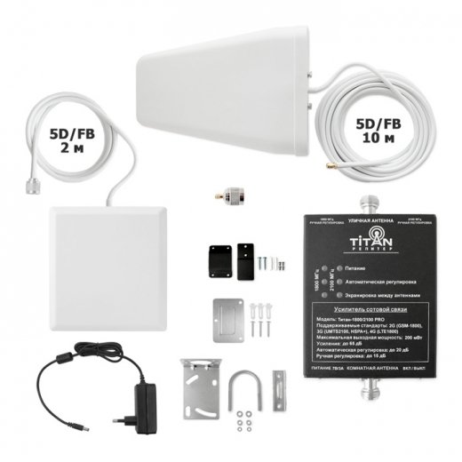 Комплект Titan-1800/2100 PRO состоит из усилителя (репитера) Titan-1800/2100 PRO и комплекта антенн MultiSet. Работает в стандартах связи GSM-1800 (2G), UMTS2100 (3G), LTE1800 (4G).