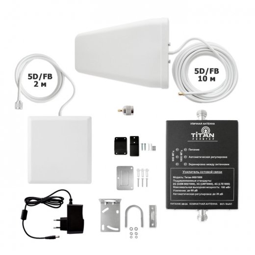 Комплект Titan-900/1800 состоит из усилителя (репитера) Titan-900/1800 и комплекта антенн MultiSet. Работает в стандартах связи GSM-900 (2G), UMTS900 (3G), GSM-1800 (2G), LTE1800 (4G).