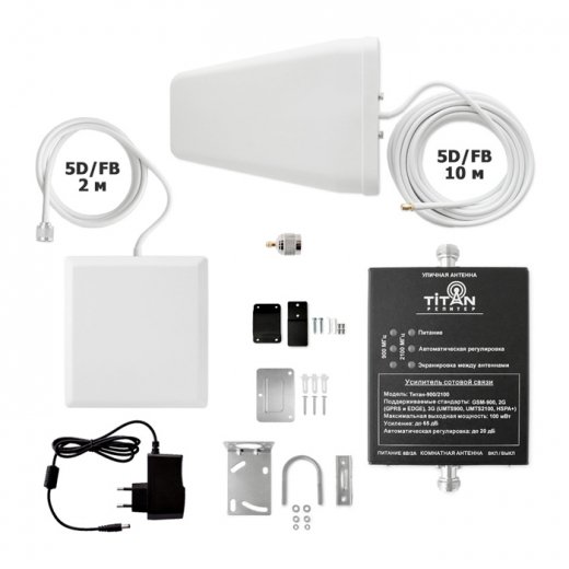 Комплект Titan-900/2100 состоит из усилителя (репитера) Titan-900/2100 и комплекта антенн MultiSet. Работает в стандартах связи GSM-900 (2G), UMTS900 (3G), UMTS2100 (3G, 2100 Мгц).