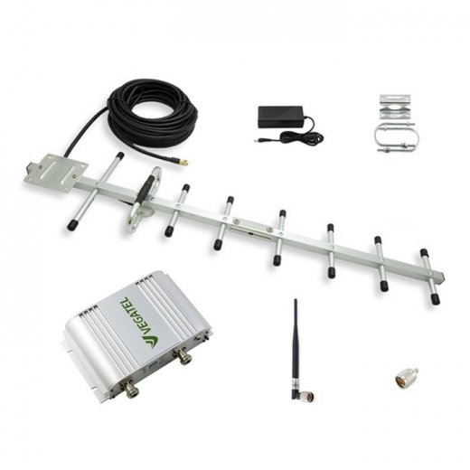 Комплект для усиления сотового сигнала VEGATEL VT1-900E-kit состоит из внешней антенны, которая устанавливается снаружи (за окном, на крыше), репитера (устанавливается внутри помещения и усиливает сотовый сигнал) и внутренней антенны (накручивается на репитер). Все необходимые расходные материалы и подробная инструкция по установке находятся в комплекте.