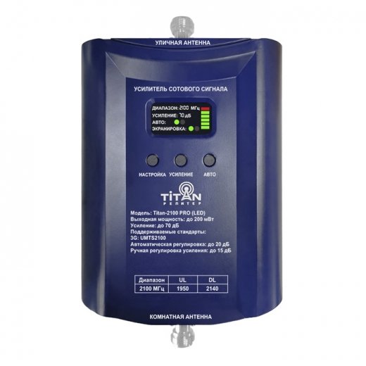 Репитер Titan-2100 PRO (LED) - является старшей моделью 2100-ой модели. Характерной особенностью этого усилителя является ручная регулировка и возросший раздающий сигнал до 1000 квадратных метров. Приятная цена, характерный дизайн, ручная/автоматическая регулировка, отличное качество исполнения и холодящий руку металл - вот что выделяет этот усилитель.