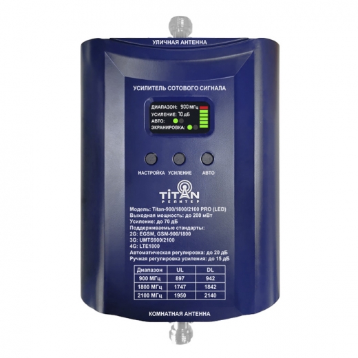 Репитер Titan-900/1800/2100 PRO (LED) - является старшей моделью 900/1800/2100-ой модели. Характерной особенностью этого усилителя является ручная регулировка и возросший раздающий сигнал до 1000 квадратных метров. Приятная цена, характерный дизайн, ручная/автоматическая регулировка, отличное качество исполнения и холодящий руку металл - вот что выделяет этот усилитель.