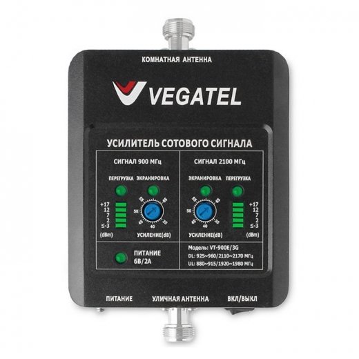 Репитер VEGATEL VT-900E/3G (LED) работает одновременно в двух частотных диапазонах 900 МГц и 2000 МГц в сотовых сетях следующих стандартов: EGSM/GSM-900 (2G), UMTS900 (3G) и UMTS2100 (3G).