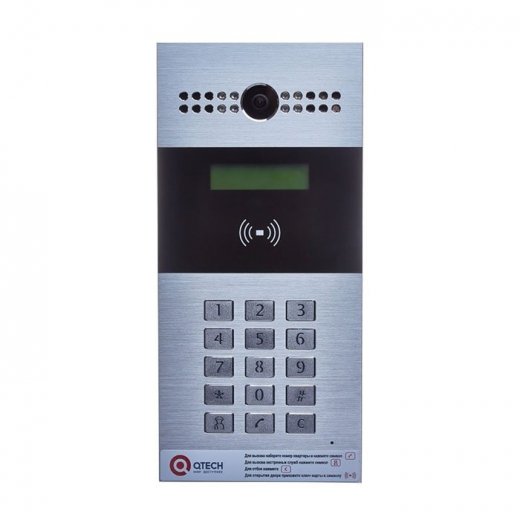 Вызывная домофонная SIP панель. 15 металлических кнопок. Встроенная камера 2MP. Отдельная кнопка быстрого вызова. Пылевлагозащита: IP65. Интерфейсы: 1порт 10/100 Base-T , Wiegand, RS-485. Три контактные группы исполнительных реле. Три контактные группы для подключения входных сигналов. Питание: DC 12 В, 1 А, PoE. PIR сенсор. Максимальное разрешение камеры 1080рх30 кадров/сек. Дисплей с функцией подогрева Металлический бокс для установки заподлицо в стену. Возможность интеграции с аналоговыми домофонными системами Vizit, Cifral. Материал корпуса легкосплавный. QTECH логотип.Поддержка стандартов MiFARE / EmMarine