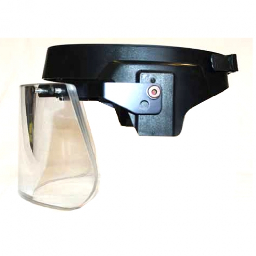 Поворотно-фиксирующее устройство обеспечивает удержание защитного экрана относительно шлема в закрытом (боевом), открытом (походном) и промежуточном положениях.