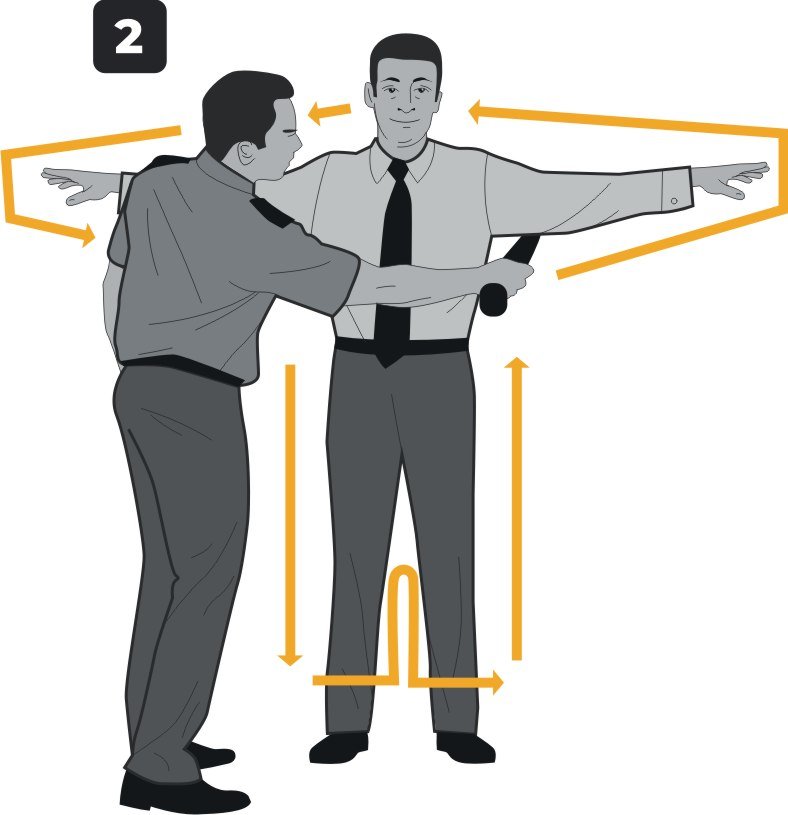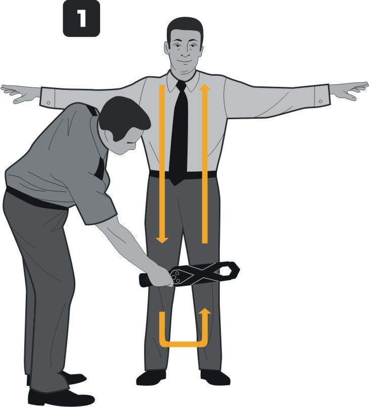 5. Проведите металлодетектором через верхнюю часть плеча и следуйте от плеча в сторону кисти руки. Переместите металлодетектор на нижнюю часть кисти и далее следуйте до подмышечной впадины. Сканируйте боковую часть тела вниз до стопы, переместите сканирующую часть металлодетектора на внутреннюю часть ноги. Продолжайте проводить досмотр снизу вверх с переходом на противоположную ногу, а затем, дойдя до противоположной стопы, перейдите на внешнюю часть ноги и поднимитесь до другой подмышечной впадины. Повторите движения в обратной последовательности, которые вы проделали с противоположной рукой, как это проиллюстрировано на рисунке 2. Обратите внимание, чтобы в процессе сканирования не допускались касания тела досматриваемого.