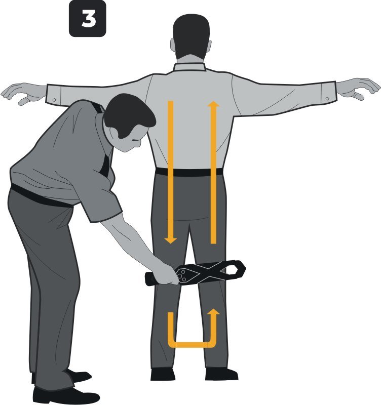 На иллюстрации ниже представлена наиболее эффективная методика досмотра человека на примере ручного металлодетектора СФИНКС ВМ-611 ВИХРЬ.
