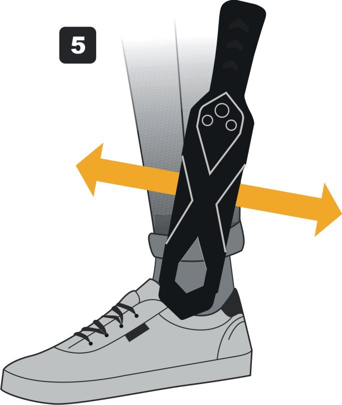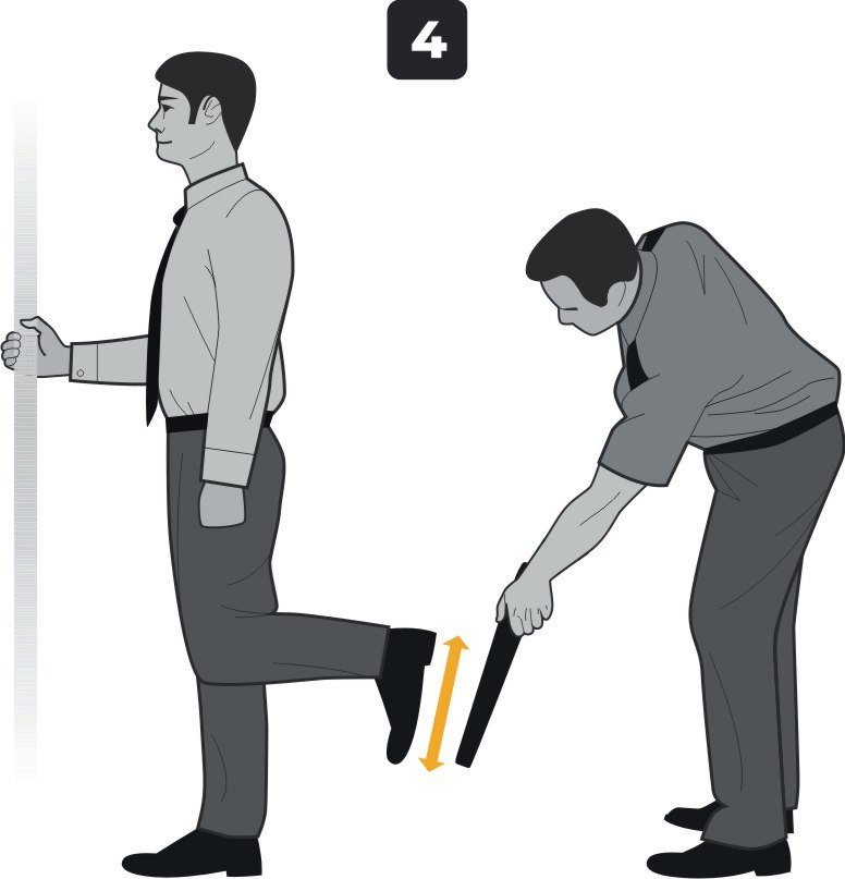 7. Если требования вашей методики досмотра (например, ИКАО) предполагают досмотр обуви, ознакомьтесь с рисунком 4. Попросите досматриваемого опереться на стол или любой другой объект и поднять ногу, согнув ее в колене под углом 90 градусов, как указано на рисунке. Просканируйте обувь со стороны подошвы. Повторите с другой ногой. При нахождении в обуви металлических супинаторов или других металлических вставок обе ноги должны вызывать одинаковое срабатывание металлодетектора. Наилучшим вариантом досмотра обуви является использование интроскопа.