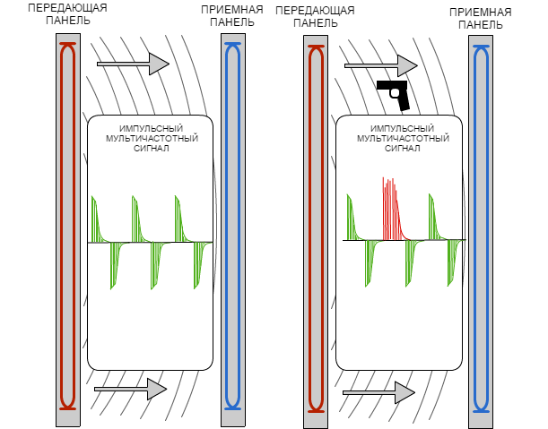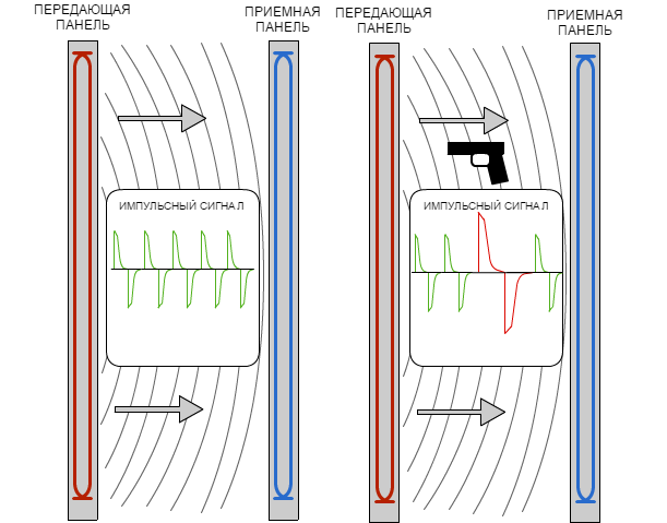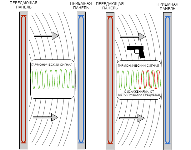 Стандартные металлодетекторы работают как две направленные друг на друга катушки (антенны), одна из них генератор переменного тока (передающая) и вторая приёмник. Импульсы тока между катушками создают магнитное поле, которое нарушается при возникновении посторонних предметов в поле действия.